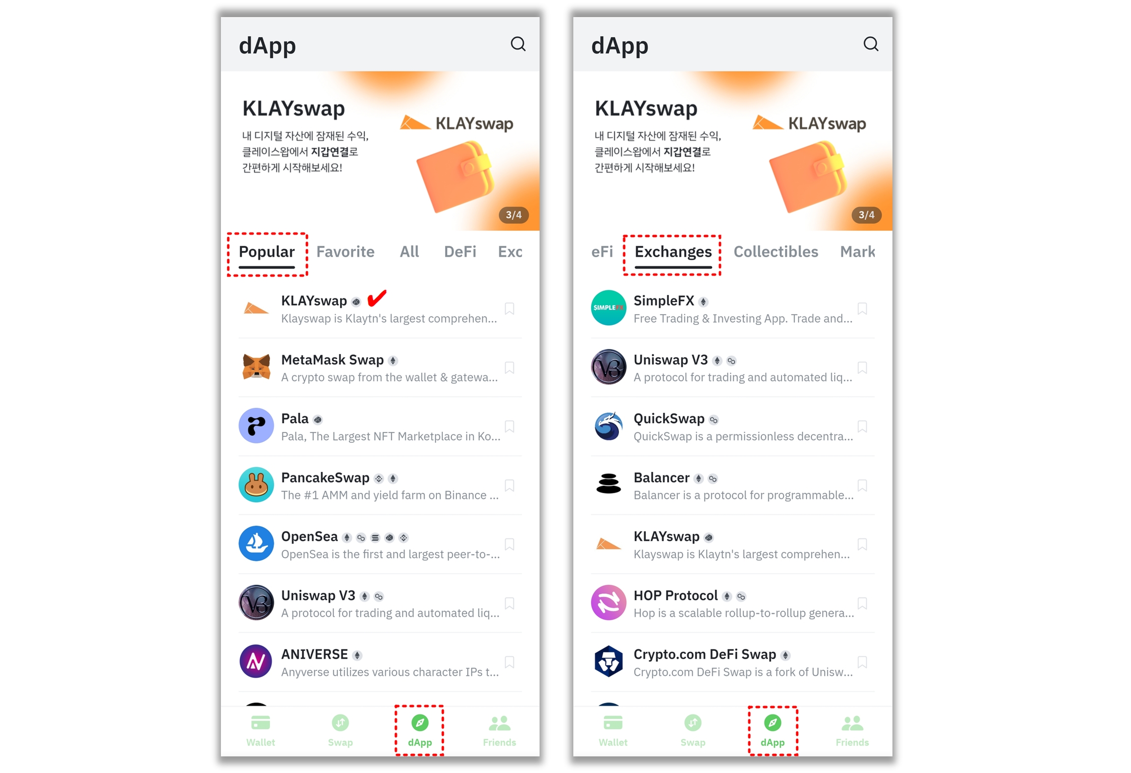 1) Select "dAPP" from the bottom menu, then select "Popular" or "Exchanges".
