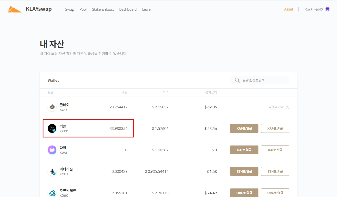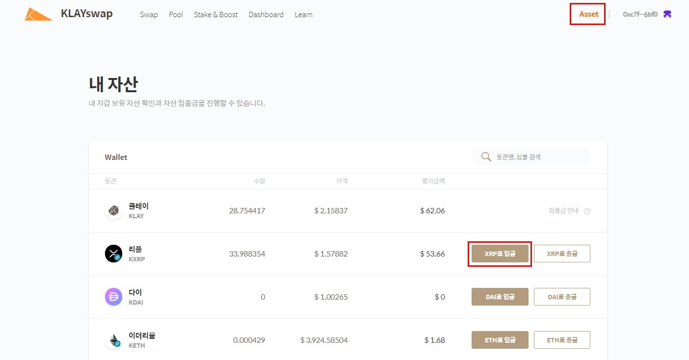 Users can directly transfer the XRP held in centralized exchanges or personal wallets to the ' XRP Deposit Address' on the 'Assets' page of KLAYswap. It will be converted into Klaytn XRP (KXRP) and deposited so that users can supply XRP liquidity.