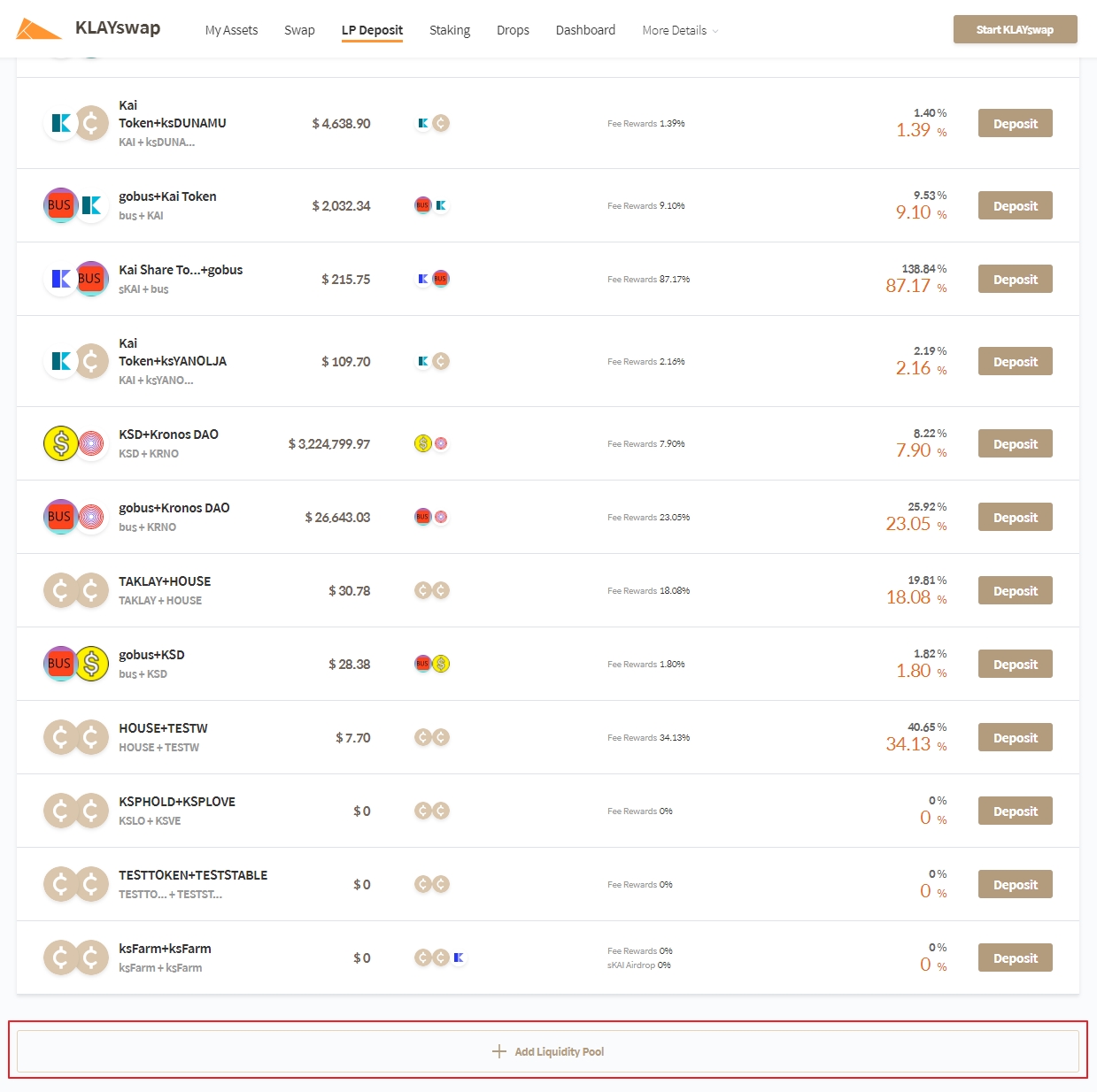 To create a liquidity pool on KLAYswap, you have to go to the ‘LP Deposit” page by clicking the menu on the top. Then, scroll down to the bottom of the page to find the ‘Add Liquidity Pool’ button, and click it.
