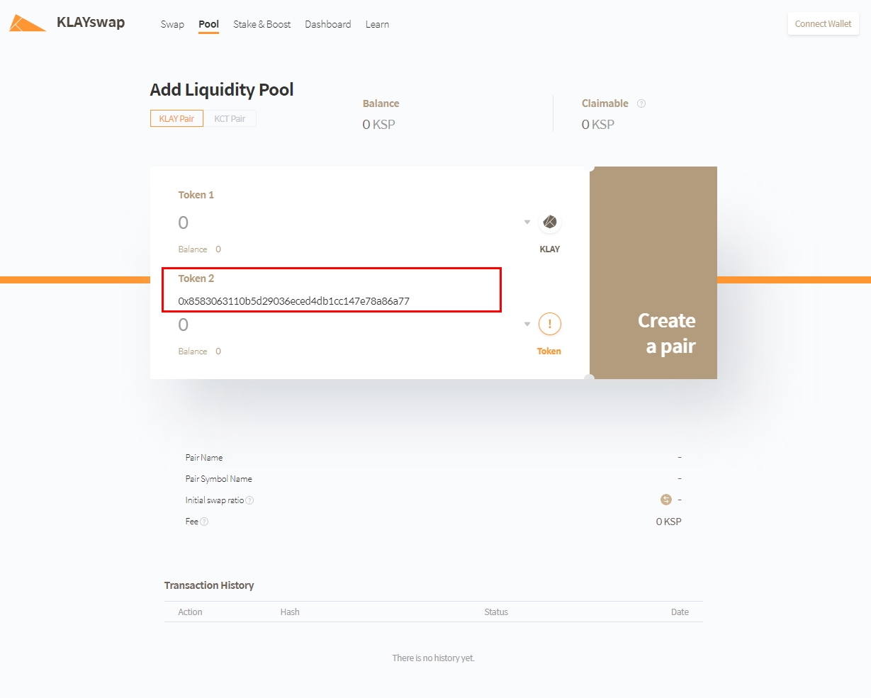 As the first liquidity provider, you have to select the ‘Token 1’ and type a contract address of the 'Token 2' in the red box with the initial exchange ratio. After then, click the ‘Create a pair’ button.