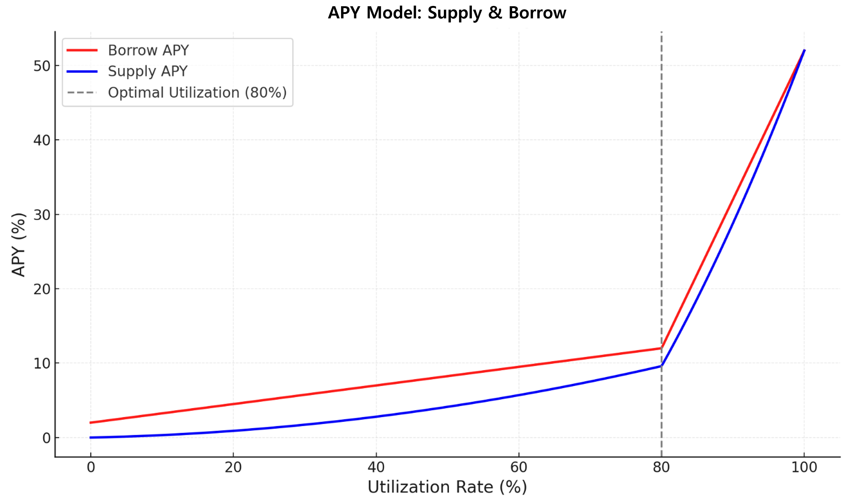 The reward rate model balances supply and demand for borrowing liquidity, ensuring the liquidity pool remains sufficiently available. As the pool utilization rate increases, higher rewards (Supply APY) are offered to incentivize supplier participation, while higher borrowing costs (Borrow APY) are applied to discourage excessive borrowing and encourage the natural return of borrowed assets. In cases of extremely high utilization, the removal of supplied assets may be temporarily delayed; however, all assets will eventually be recoverable without any permanent loss.