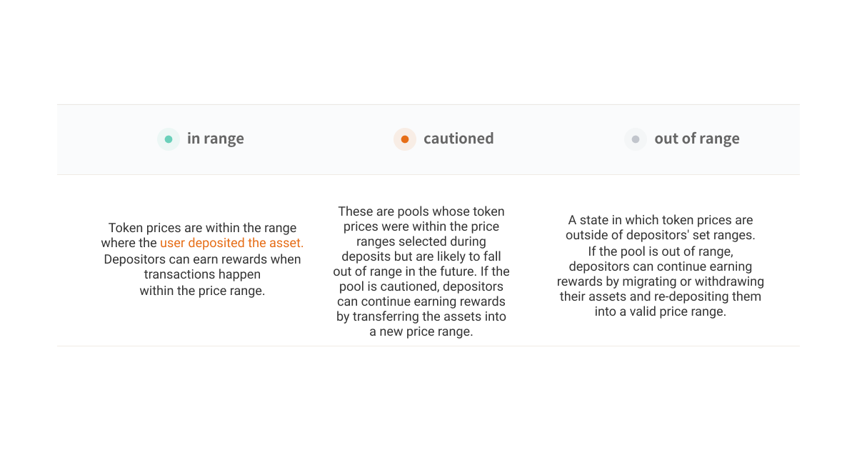 V3 pool suppliers provide liquidity at specific prices where they anticipate transactions occurring, and they receive pool usage fee profits when transactions occur in their assets (liquidity). However, if the current token price is out of the price range they supplied (out of range), supplied assets will no longer be used for swaps, and they will not be able to earn rewards distributed by the pool (swap fees and reward tokens). Thus, suppliers are required to manage their assets carefully to ensure the price ranges they supplied are valid (in range).