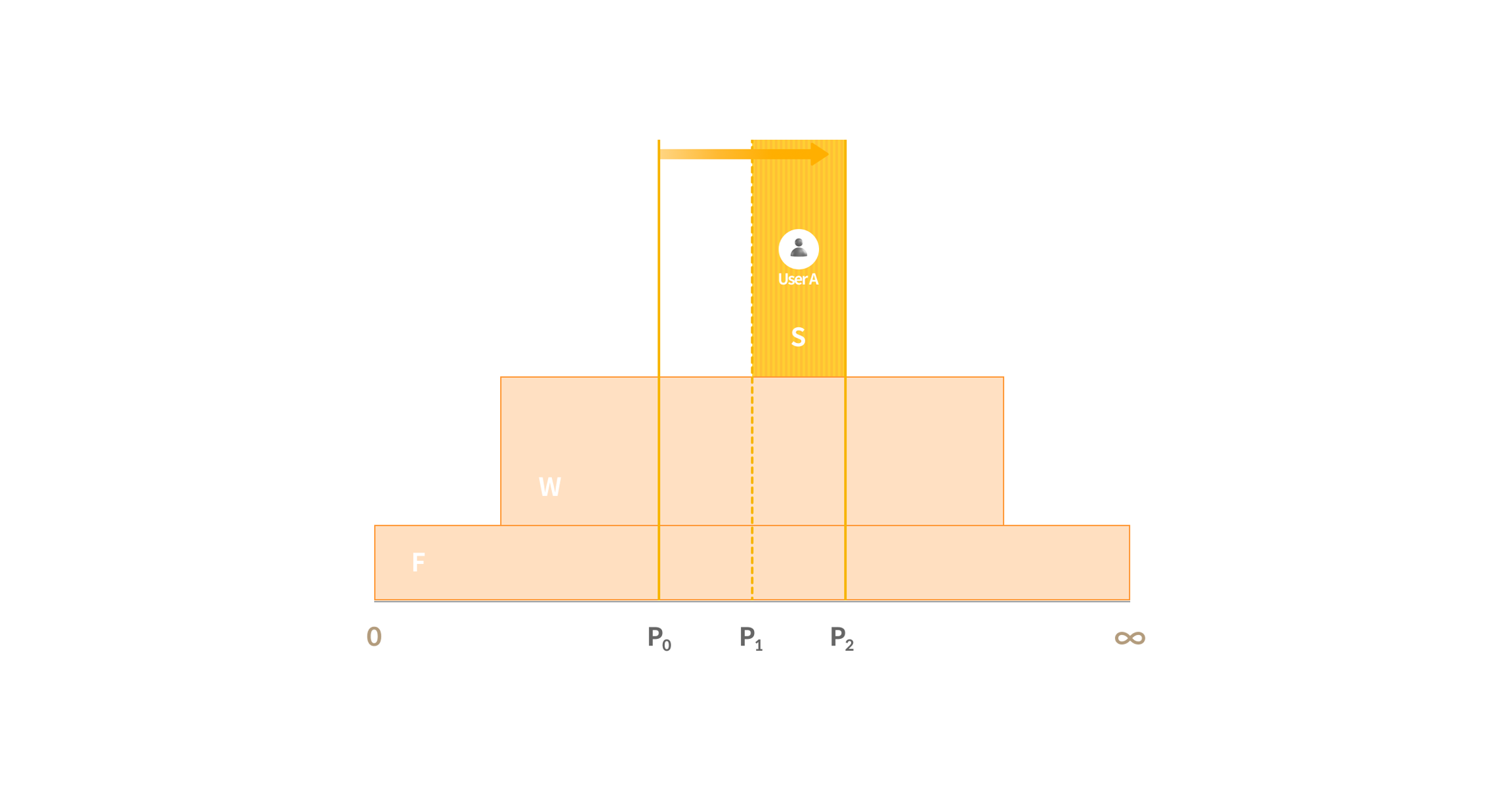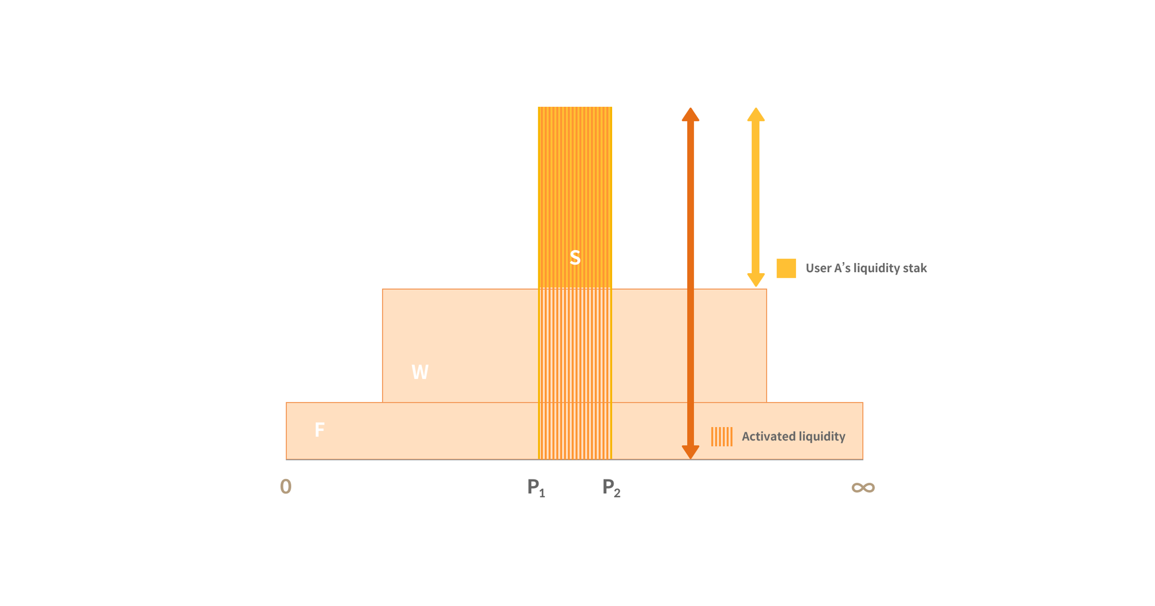 If the token price changes from P0 to P2 due to a transaction within the pool, User A's assets will not be used in the P0 to P1 range. Instead, user A's liquidity will be used for trading in the P1 to P2 range. The share ratio of user A in the active trading liquidity in the P1 to P2 range is (user's liquidity (A)/activated liquidity (T).