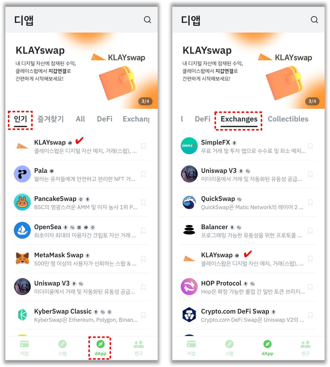 1) 하단 메뉴에서 “dAPP” 버튼을 클릭한 후, dAPP 페이지에서 상단의 “인기” 탭 또는 “Exchanges” 탭을 클릭합니다.