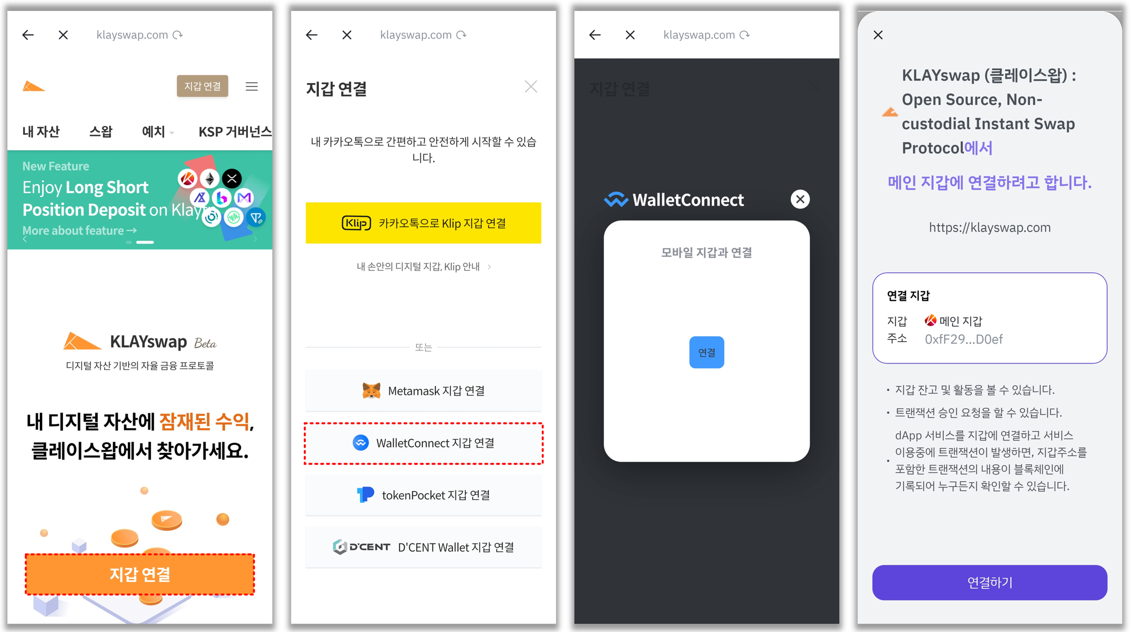 2) KLAYswap에 접속하고, [지갑 연결] 버튼을 클릭합니다. [WalletConnect 지갑 연결]을 클릭해 메인 지갑 연결을 진행합니다.
