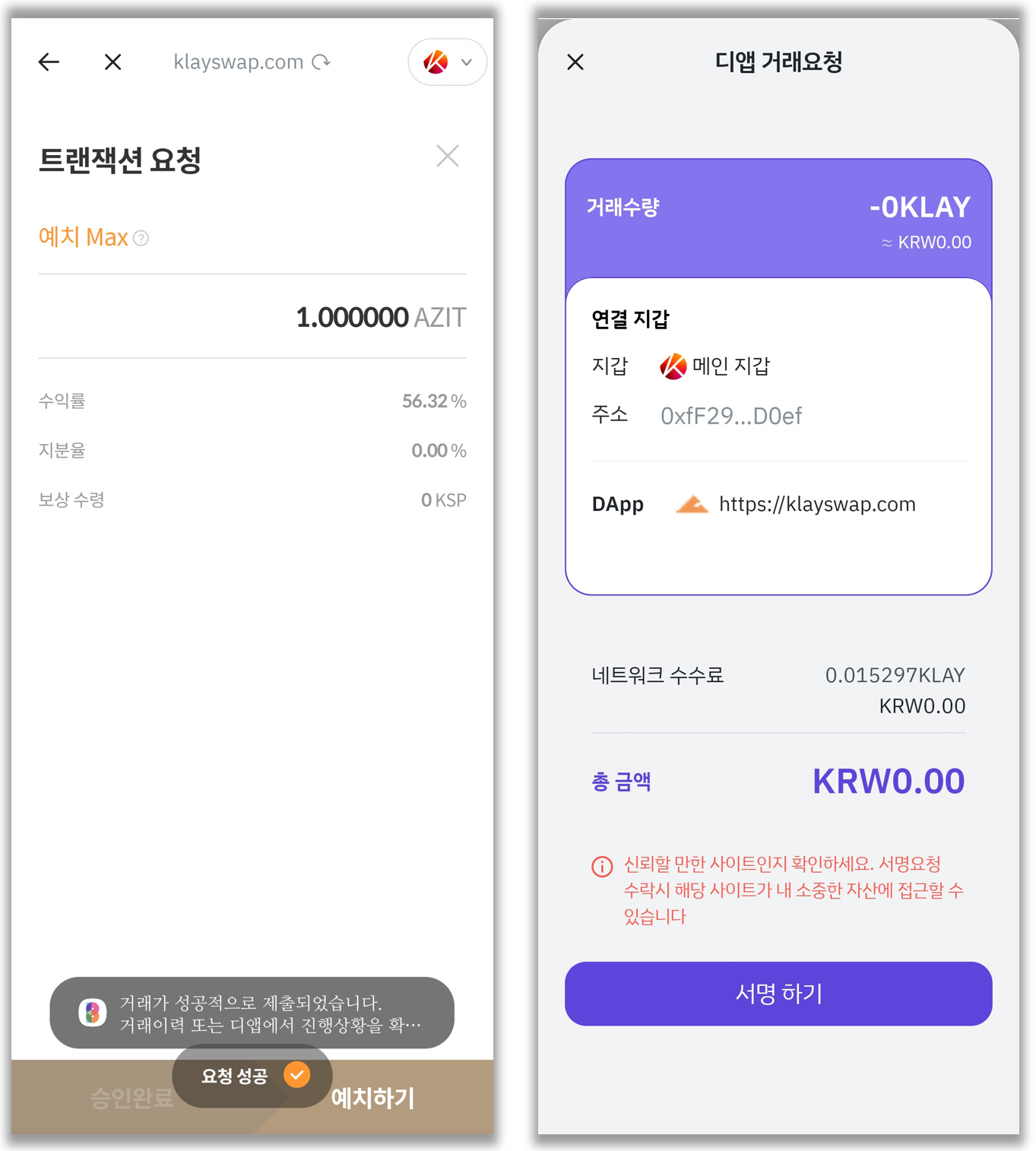 선택한 자산을 KLAYswap에서 거래한 이력이 없다면, 단일 예치 트랜잭션을 진행하기 전에 토큰 승인 트랜잭션이 선행됩니다 (최초 1회에 한함).