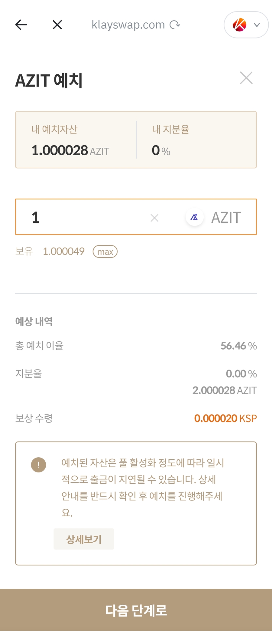3) 자산 예치 팝업에서 보유 수량을 확인한 후, 예치할 수량을 입력하세요. “예상 내역”에서 예치를 진행할 경우의 총 예치 이율과 지분율을 확인할 수 있습니다. 확인을 마친 후 [다음 단계로] 버튼을 클릭해 주세요.