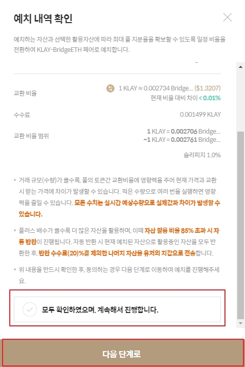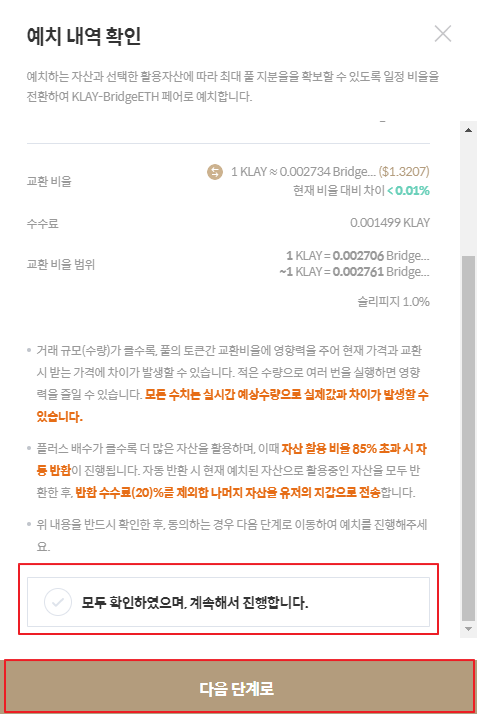7. 플러스 예치 트랜잭션 요청창에서 플러스 예치에 대한 정보를 확인한 뒤 [모두 확인하였으며, 계속해서 진행합니다]체크박스 선택 후 [다음단계로] 버튼을 클릭합니다.