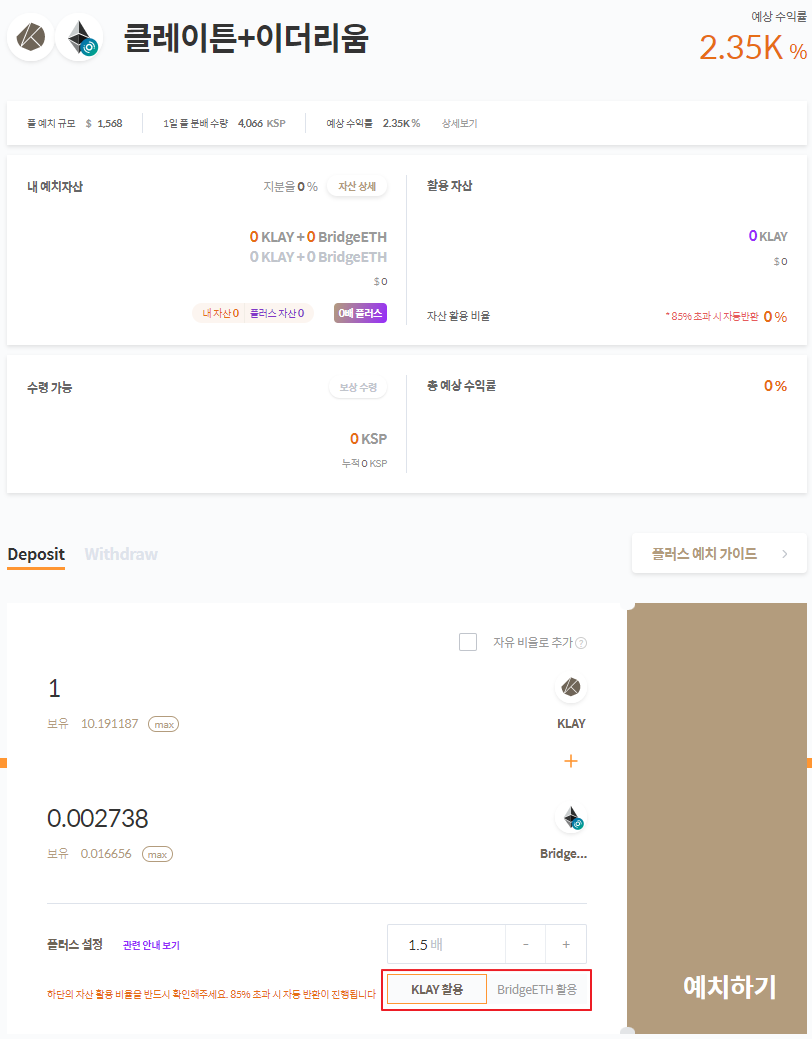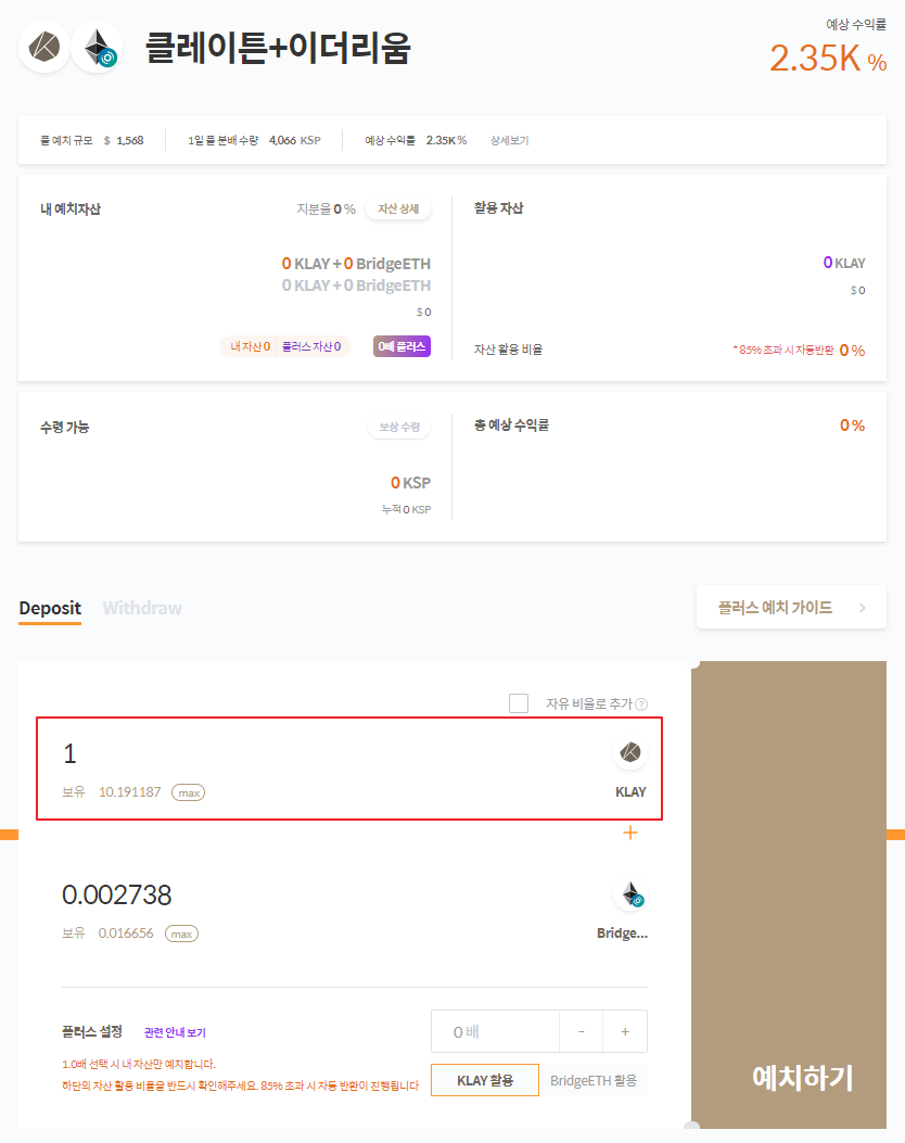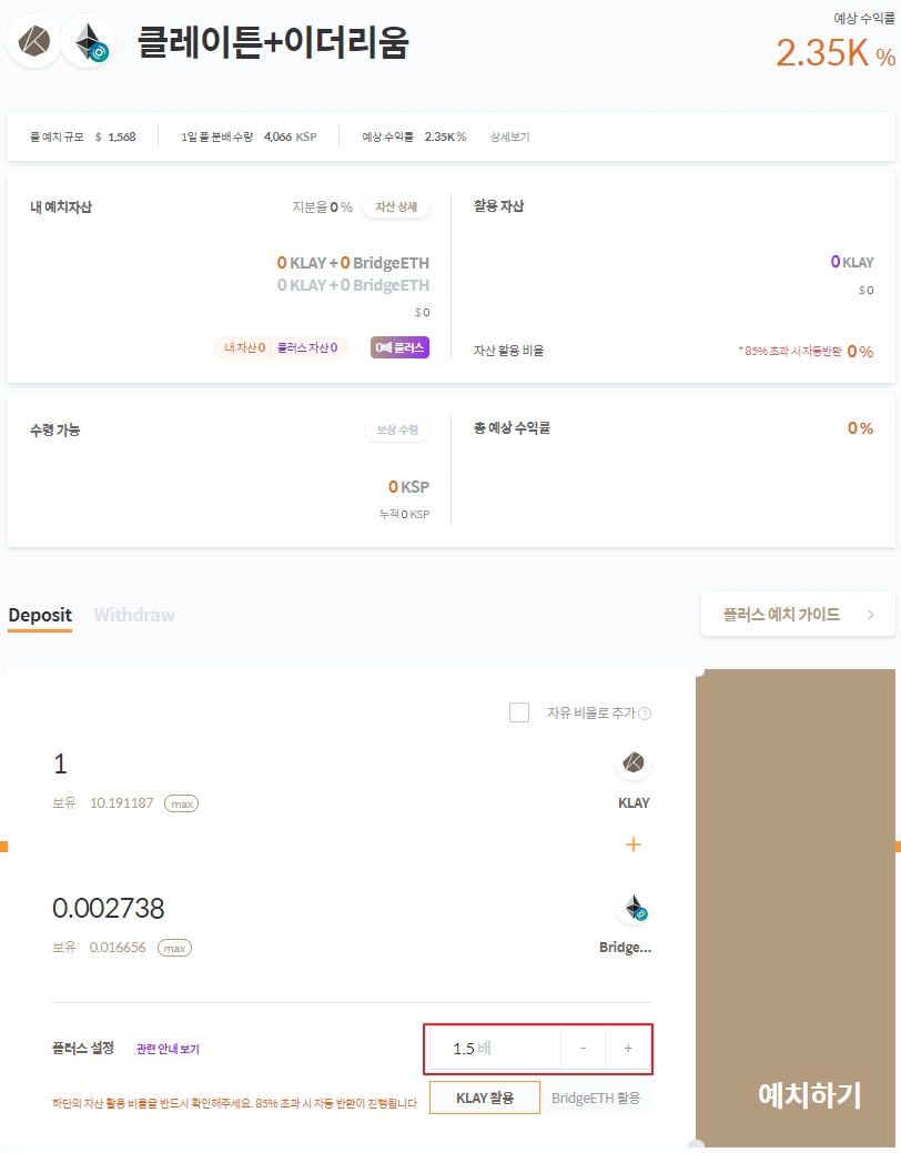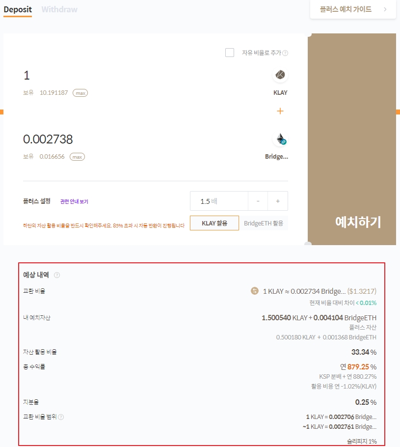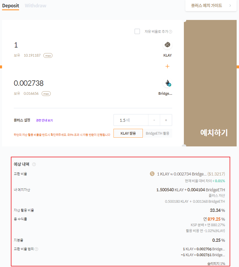 6. 예상 내역에서 플러스 예치에 따른 여러 정보를 확인합니다. “자산활용비율” 85% 초과 시 자동반환이 진행됩니다. 따라서 “자산활용비율”을 반드시 확인한 후 [예치하기] 버튼을 클릭해주세요.