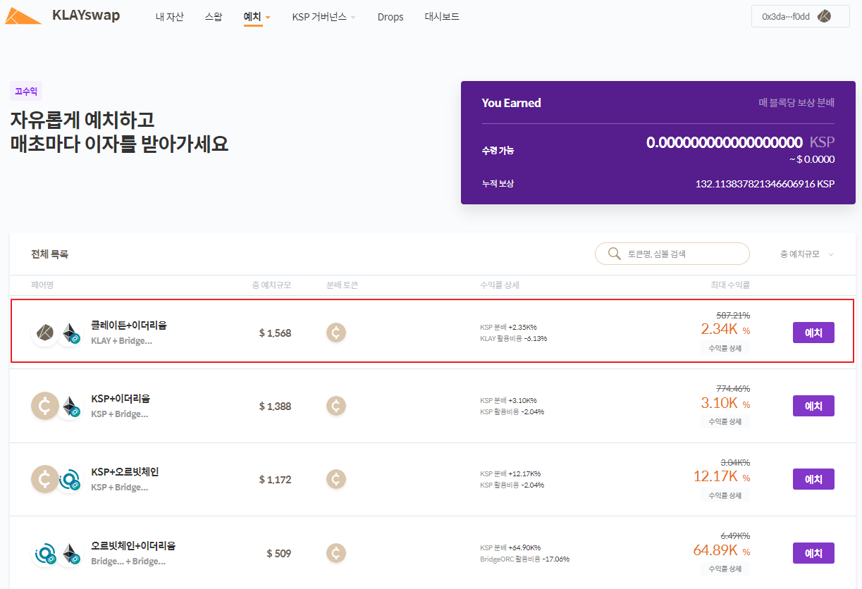 2. 플러스 예치 하고자하는 페어를 확인한 후, 풀 목록에서 [예치] 버튼을 클릭하여 상세페이지로 이동합니다.