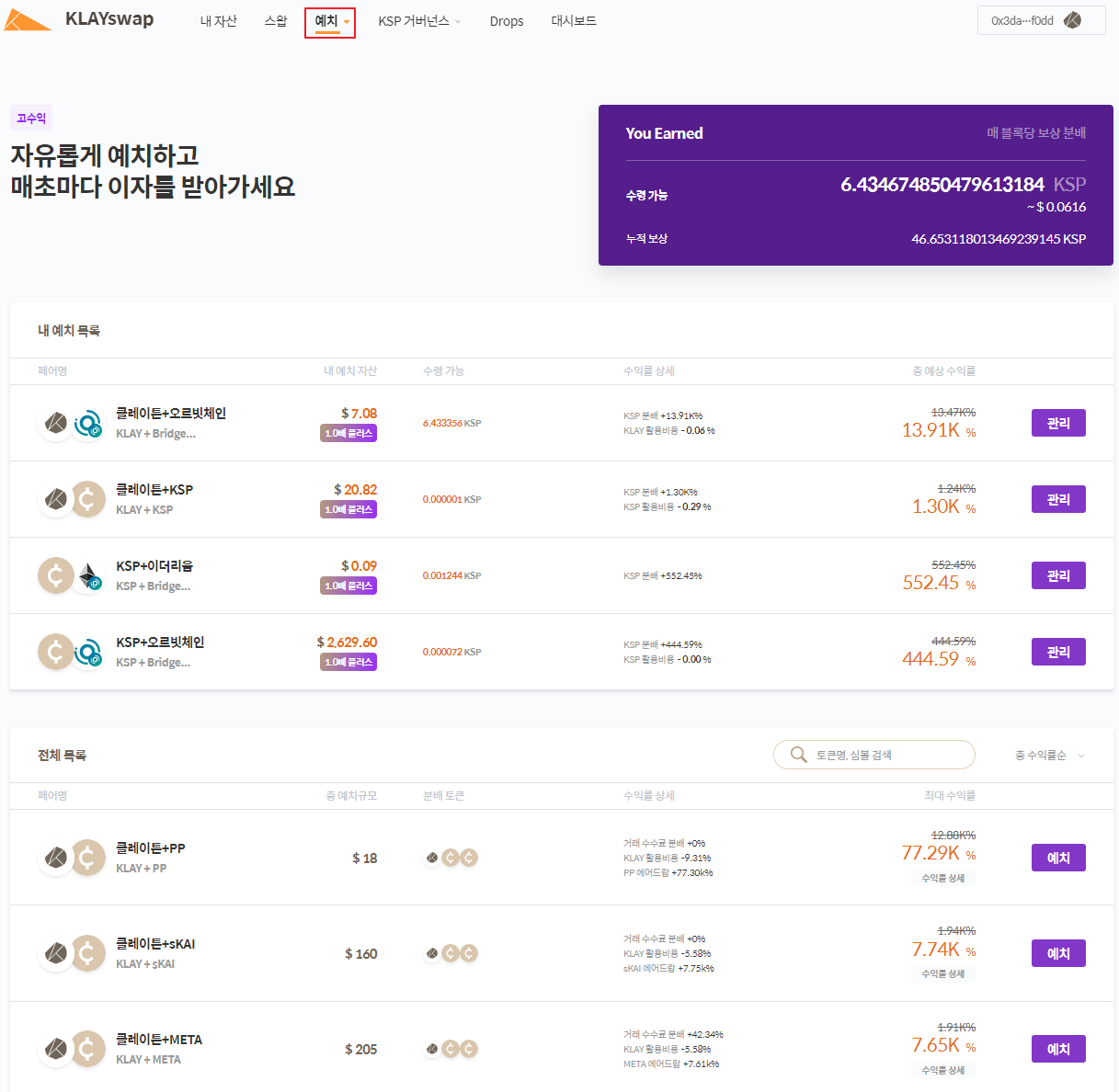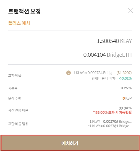 10. [승인하기] 완료 후 [예치하기] 버튼을 클릭하면 예치가 최종 완료됩니다. 예치/출금으로 잔액 변동 시 현재까지 분배된 KSP 보상이 자동으로 유저 지갑으로 수령됩니다.