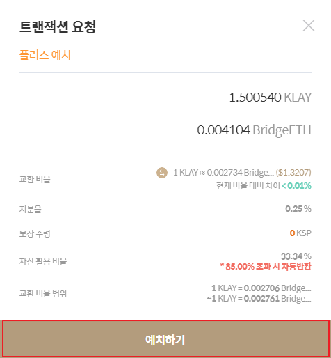 [자유비율로 추가] 버튼을 클릭하지 않고 그냥 수량을 입력하는 경우 일반 페어예치와 동일하게 가격 교환 비율에 따라 예치가 진행됩니다.