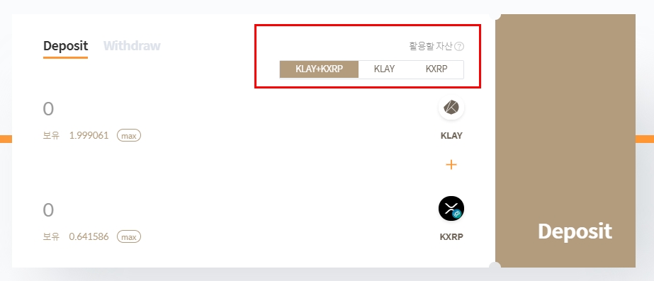 예치할 페어의 상세 페이지상에서 "활용할 자산" 옵션을 확인합니다. [클레이튼+리플] 옵션이 기본 선택된 상태에서 예치하기 위해서는 두 개의 자산을 모두 보유하고 있어야 합니다.