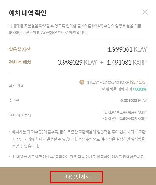 3. 이때, 화면 하단에서 스왑 후 예치와 관련된 상세 내역을 확인할 수 있습니다. 사용자는 내 예치과정에서 발생할 수 있는 변동 사항에 대해 충분히 숙지하고, 이를 이해한 경우에 예치를 진행해야 합니다. 표시되는 정보는 모두 실시간 예상 정보로, 실제 예치 과정에서 차이가 발생할 수 있습니다.