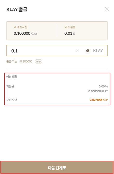 3. 출금하고자 하는 자산의 수량을 기입하여 “예상 내역” 확인한 후 [다음 단계로] 버튼을 클릭합니다.