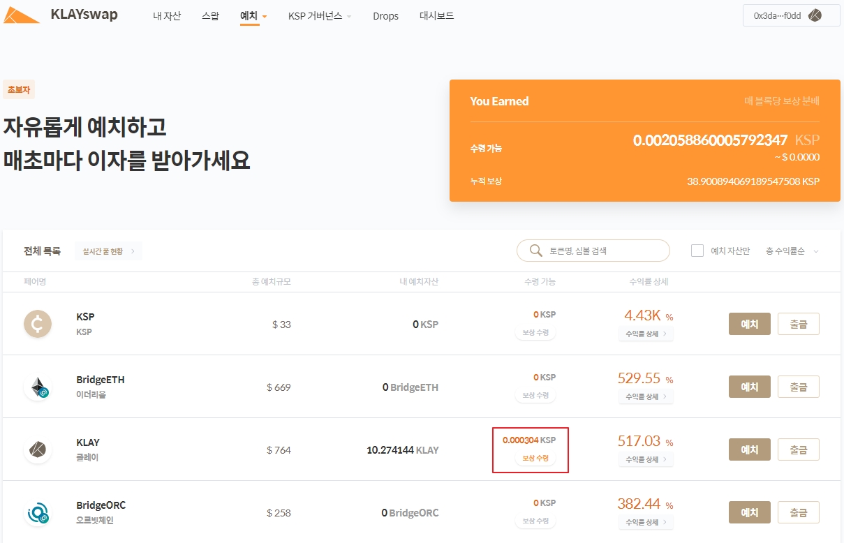 6. 출금이 완료되면 지갑에서 출금한 자산을 확인할 수 있습니다. 예치/출금으로 잔액 변동 시 현재까지 분배된 KSP 보상이 자동으로 유저 지갑으로 수령됩니다. 출금과 별도로 KSP 보상은 언제든지 [보상수령] 버튼을 클릭해서 수령할 수 있습니다.