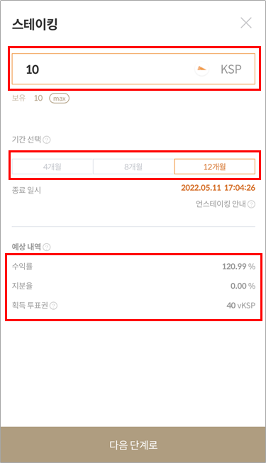 2. 팝업상에서 스테이킹 할 KSP 수량 을 입력하고, 스테이킹 기간을 선택합니다. 팝업 하단에서 스테이킹 종료일시 및 상세 내역을 확인한 후 [다음 단계로] 버튼을 클릭합니다. 표시되는 정보는 모두 실시간 예상 정보로 , 실제 스테이킹 완료 후 차이가 발생할 수 있습니다.