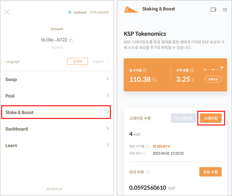 1."Stake & Boost" 메뉴로 진입하여 [스테이킹] 버튼을 클릭합니다.