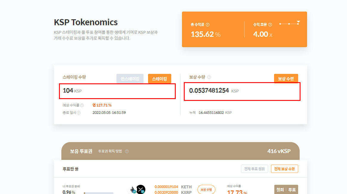 수익률 스테이킹으로 획득할 연간 예상 KSP 수익률 입니다. 장기 KSP 스테이킹 계약일수록 더 높은 스테이킹 수익률을 적용받습니다.