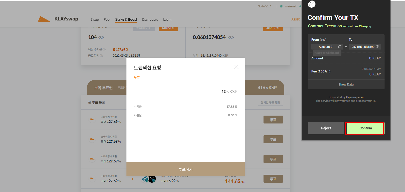 3. 최종 풀 투 내역을 확인 후 [투표하기] 버튼을 클릭합니다. 자동으로 카이카스 지갑으로 트랜잭션 요청이 실행되며, [Confirm] 버튼을 클릭하여 투표하 트랜잭션을 완료합니다.