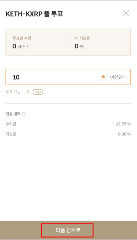 2. 팝업상에서 투표할 수량을 입력합니다. 팝업 하단에서 상세 내역을 확인한 후 [다음 단계로] 버튼을 클릭합니다. 표시되는 정보는 모두 실시간 예상 정보로 , 실제 스테이킹 완료 후 차이가 발생할 수 있습니다.