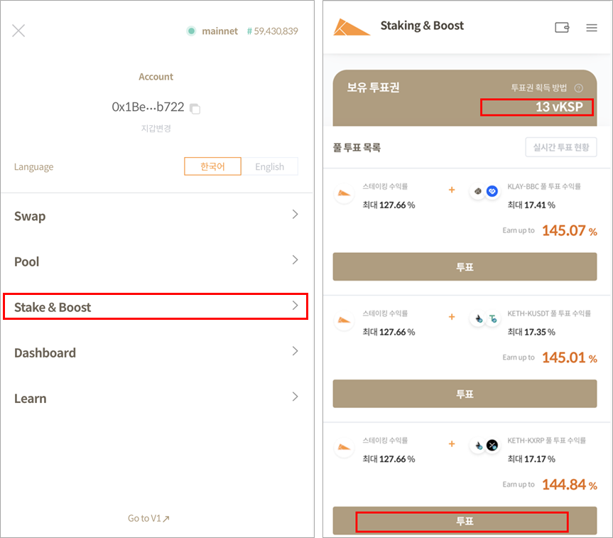 1."Stake & Boost" 메뉴로 진입하여 투표 가능한 풀 목록에서 투표할 풀을 클릭합니다. 현재 내가 보유한 총 투표권 수량은 "보유 투표권" 영역에서 확인할 수 있습니다.