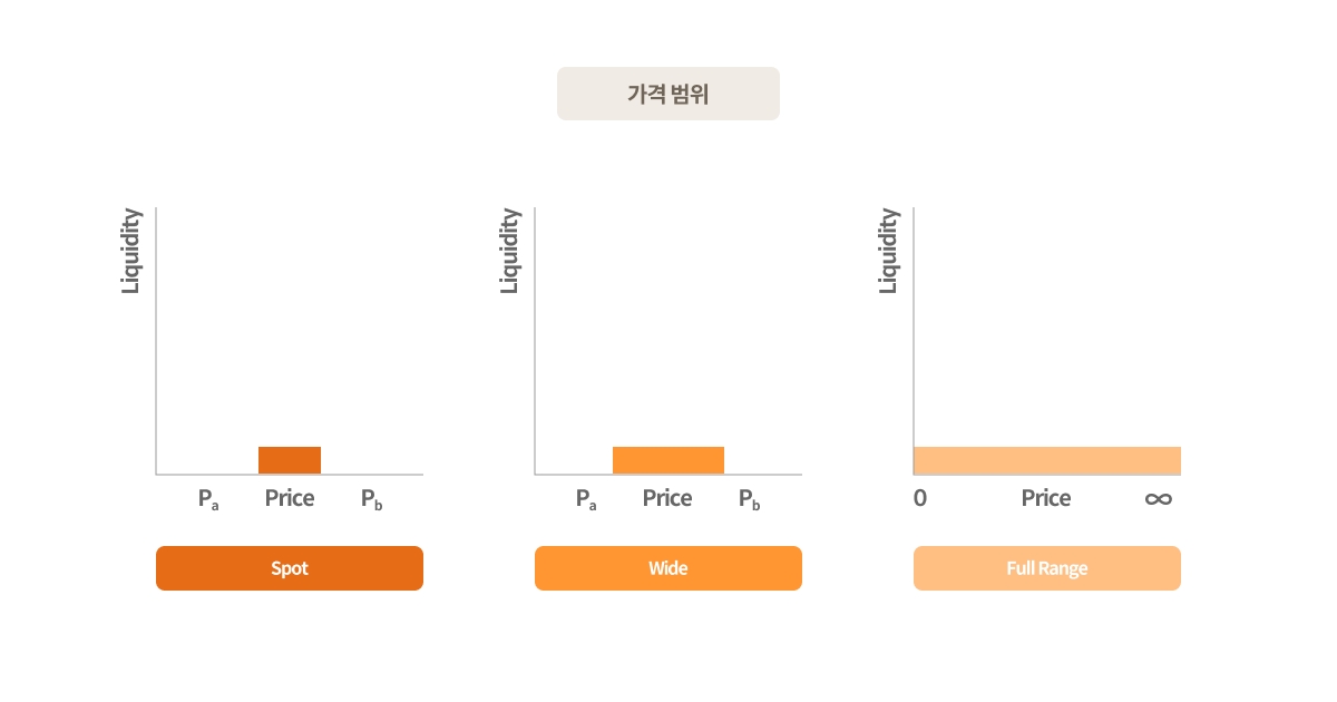 '가격 범위'란, 공급하는 자산이 거래에 활용될 최소가격과 최고가격 구간을 의미하며, 이 가격 범위 내에서 거래가 발생하면 공급자는 풀 이용 수수료를 분배받을 수 있습니다. 각 가격 범위의 특징은 다음과 같습니다.