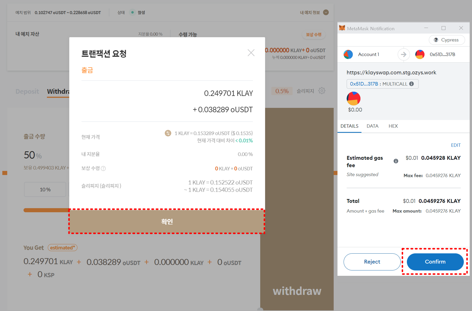 4. “트랜잭션 요청” 팝업에서 예상 정보를 확인한 후, [확인] 버튼을 클릭합니다. 최종적으로 정보를 확인하였다면, 지갑에서 [Confirm] 버튼을 눌러주세요.