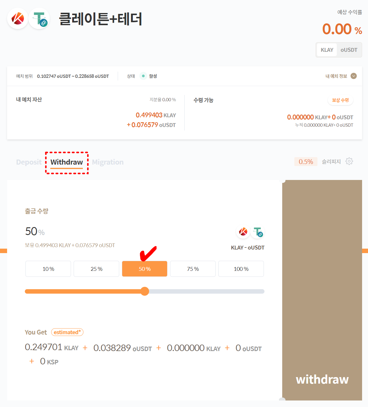 3. “You Get”에서 출금 시 수령하는 토큰과 보상(거래 수수료 보상, KSP, 에어드랍) 정보를 확인한 후, [Withdraw] 버튼을 클릭합니다.