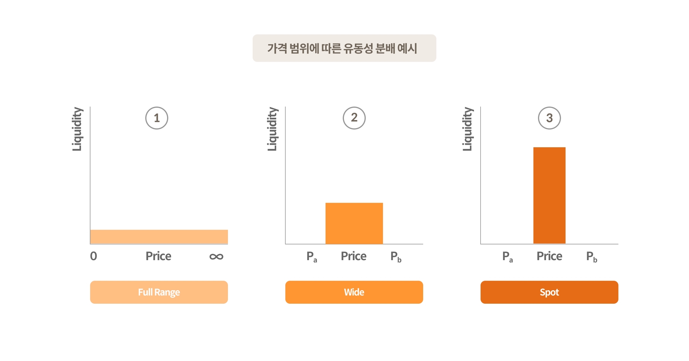 동일한 $ 1,000 규모의 자금을 Full range 범위에 예치하는 경우, 자산은 ① 과 같이 전체가격 범위 (0~∞)에 균일하게 예치됩니다. 하지만 이 보다 더 제한된 가격 범위 (Pa~Pb)에 자산을 예치하는 경우(②,③) 거래가 발생했을 때 풀 내에서 더 높은 유동성을 공급한 효과를 얻을 수 있습니다.